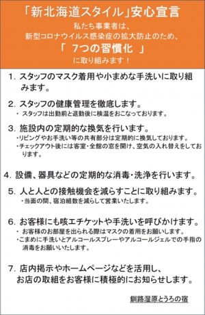 ※ 新型コロナウィルスに関してはまだ不透明な部分も多く、国や道からは現時点では具体的な指針が出されておりません。当宿といたしましても手探りではありますが、できうる限りの対策を講じてお客様を迎える準備をしております。新型コロナウィルスの対策に伴い、行政より待機要請を受けた場合には、ご連絡の上、お客様の宿泊予約のキャンセルまたは予約変更をお願いする場合がございます。宿泊予約のキャンセルをお願いする場合、ご迷惑をおかけしておりながら大変心苦しいのですが、補償等の対応はご容赦いただいております。何卒ご理解ご了承をお願いいたします。 釧路湿原とうろの宿